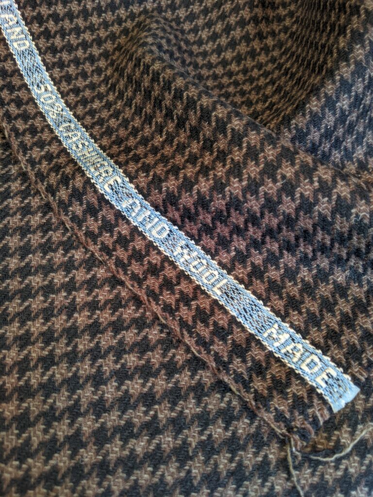 カシミヤ50%、ウール50%からなる茶×黒の千鳥格子柄のジャケット地。カシミヤのウォーム感や柔らかさに、ウール由来の復元力やハリコシが加わった高級生地になります!ヴィンテージ生地ながら、茶×黒の千鳥格子柄は今こそご着用いただきたい絶妙な色の組み合わせ。そして、茶色の糸は濃淡2色を使用しており、立体感のある表情も素敵です。千鳥格子の柄の大きさも、約1cmと大き過ぎず小さ過ぎずの最適な大きさの柄。この生地は間違いないですよ!